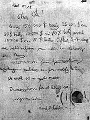 |  広大なリンドバーグ邸  誘拐されたチャールズ・リンドバーグ・ジュニア  現場に残されていた手紙 |  チャールズ・リンドバーグを知らない方はおられないと思う。また、その愛児が誘拐され、無惨に殺害されたことも殆どの方が御存知だろう。だが、その犯人として処刑されたブルーノ・ハウプトマンに冤罪の疑いがあることは我が国ではあまり知られていない。中にはリンドバーグ自身が関与していたとの奇説もあり、さすがにこれは眉唾だが、ハウプトマン冤罪説自体にはかなりの信憑性がある。以下、具体的に検証してみよう。 |