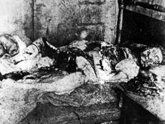|  メアリー・ジェーン・ケリーの遺体 |  そして11月9日、メアリー・ジェーン・ケリーが最後の犠牲者となった。彼女も他の犠牲者と同じく街娼だったが、25歳と若く、しかも犯行は屋外ではなく彼女の自室だった。そのために時間的余裕があったのだろう。犯人は思う存分に切り裂いた。当時の新聞は惨状をこのように記述している。 |