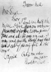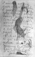 |  犯人からの手紙か? |  どうやらトンデモない殺人鬼がいることに気づいたのは、アニー・チャップマンが殺されてからだ。新聞各紙は「皮エプロン」の噂で持ちきりだったが、検視官は「皮エプロン」の犯行ではないことを指摘した。  医療関係者による犯行の可能性が指摘された数日後、エリザベス・ストライドとキャサリン・エドウズが立続けに殺された。エリザベスは臓物を摘出されていなかったことから、おそらく通行人の邪魔に遭ったのだと思われる。そこで目的を遂げるべくキャサリンを襲ったのだ。 「ユダヤ人はみだりに非難を受ける筋合いはない」 「親愛なる編集長殿。 |